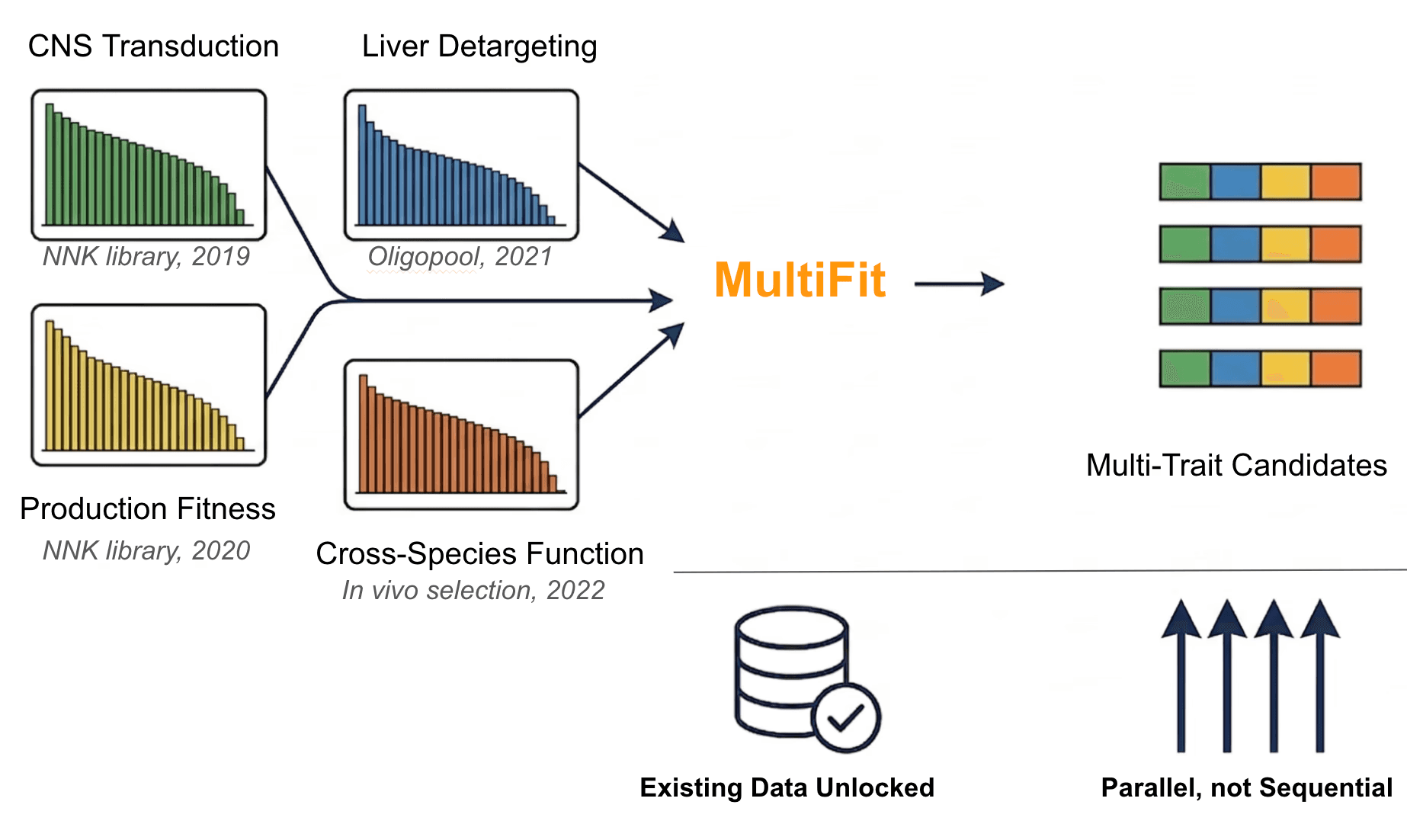 MultiFit learns sequence-to-function relationships independently from each dataset, regardless of library origin, institution, or timepoint. It finds their intersection computationally. Without returning to the bench for sequential screens.