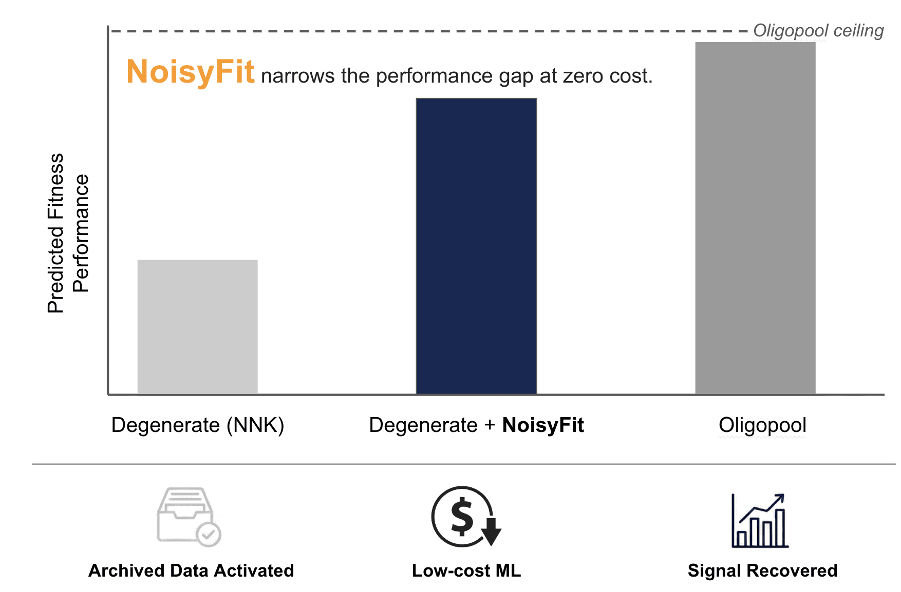 NoisyFit is a training approach built specifically for this data type. It extracts meaningful predictive signal from randomized library screens that conventional training cannot use, turning accumulated archives into an active ML foundation without new experiments. This also lowers the bar for future screens: programs no longer need expensive controlled assays to generate ML-compatible training data.